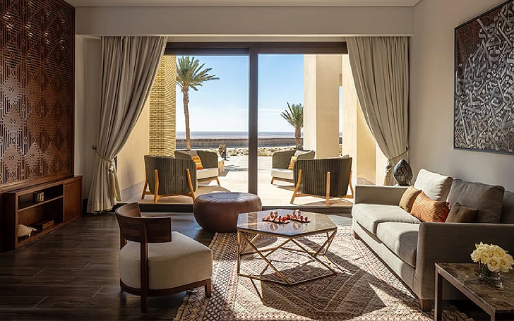 Votre villa est idéale pour se reposer au calme, avec un salon spacieux orné de céramiques, de tissus, de lanternes et de sculptures sur bois dans l'esprit berbère et moderne. Prenez le petit déjeuner sur la terrasse et profitez de l'air frais du matin. Prenez un bain dans la baignoire encastrée avec vue sur le désert encadrée par une baie vitrée, dans votre villa dans le meilleur hôtel de Tunisie. Lire plus